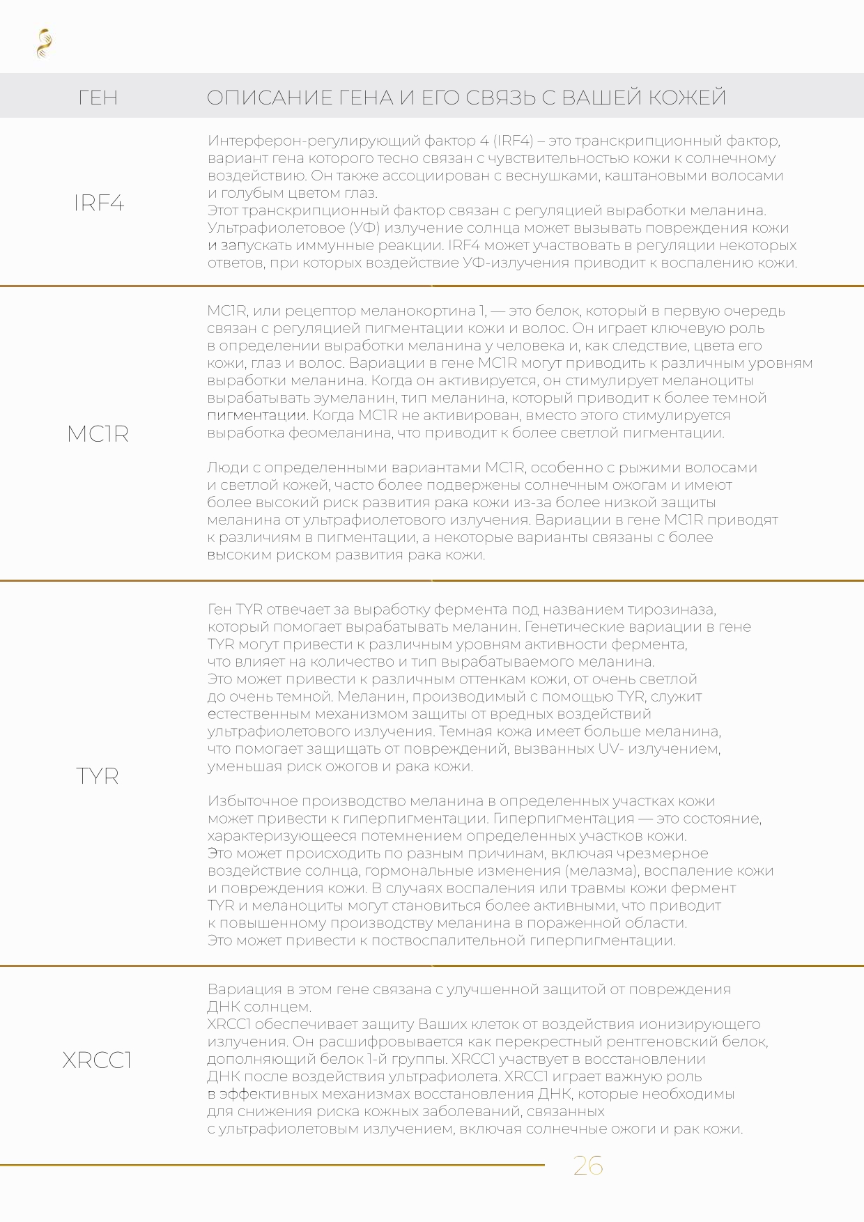 Мы анализируем более 100 генов, чтобы создать персональный генетический паспорт красоты и помочь вам подобрать идеальный уход на основе вашей ДНК. Анализ семи ключевых аспектов здоровья кожи показывает: